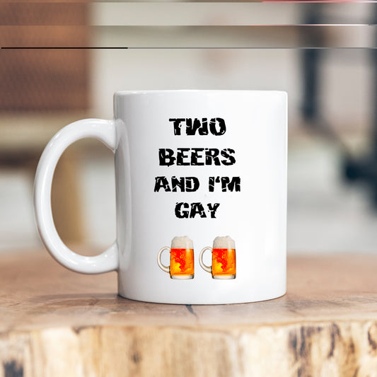 Two Beers and I'm Gay Mug, Funny Offensive Banter Insult, Personalised Gift Cup for Friend, Brother